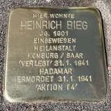 Heinrich Bieg wurde am 13. Dezember 1901 in Niederwürzbach geboren. Wie viele junge Männer des Saargebiets ging er in die Französische Fremdenlegion. Er wurde in Afrika eingesetzt und kam vermutlich mit einer posttraumatischen Belastungsstörung zurück, die durch diesen Kampfeinsatz ausgelöst wurde. Zu einem heute nicht bekannten Zeitpunkt wurde er wegen der psychischen Probleme in die Heilanstalt Homburg/Saar aufgenommen. Von Homburg wurde er gemeinsam mit 145 weiteren Patient*innen am 2. September 1939 in die Heilanstalt Weilmünster verlegt. Von dort aus gelangte er am 31. Januar 1941 in die Tötungsanstalt Hadamar und wurde am selben Tag noch in der Gaskammer ermordet.