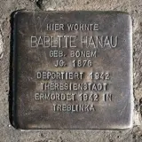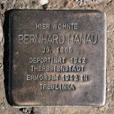 Bernhard Hanau, geboren 1865 in Merzig, heiratete Babette Bonem, geb. 1876 in Wawern, wahrscheinlich 1909/1910. Bernhard brachte aus der ersten Ehe drei Kinder mit. Aus der Ehe mit Babette ging ein Sohn, Alfred, geb. 1911, hervor. Die Famile zog 1921 nach Losheim am See und verdienten sich ihr Geld mit Viehandel. In der Reichsprogromnacht am 09. Novermber 1938 stürmte die SA ihr Haus und zertörte alles und enteignete ihre Wertgegenstände. Mit einem befreundeten Ehepaar Herrmann (siehe auch Stolpersteine Familie Herrmann) wurden sie in ein Judenhaus nach Trier geschickt. Im Juli 1942 wurde das Ehepaar in das Ghetto bzw. Lager Theresienstadt deportiert und von dort aus in das Vernichtungslager Treblinka deportiert. Hier wurden sie am 10. September 1942 ermordet.