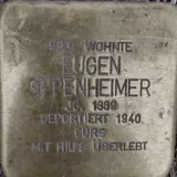 Eugen Oppenheimer wohnte 1940 in Homburg am Marktplatz 15. Nach seiner Deportation am 22.10.1940 von Homburg nach Gurs (Südfrankreich) war er dort in Ilot G, Baracke 17 untergebracht. Am 21.02.1941 kam er in das Lager Noé. Er überlebte die Lageraufenthalte und kehrte nach Homburg zurück. Er verstarb dort am 29.01.1950. Er wurde auf dem jüdischen Friedhof in Homburg beerdigt.