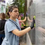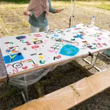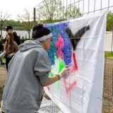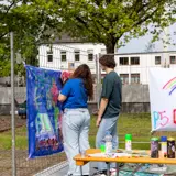 Neben den Infos zur Geschichte des Lagers und den praktischen Arbeiten auf dem Gedenkstättengelände gab es bei den Angeboten der aej saar und des saarländischen Jugendrotkreuz für die Teilnehmenden die Möglichkeit, ihre Erfahrungen beim Kerzen gestalten kreativ zu verarbeiten oder eigene Botschaften zum Thema Vielfalt auf einer großen Leinwand auszudrücken.