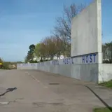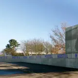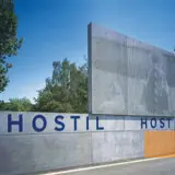 Am 13. Januar 2000 gab es eine Ausschreibung für die Neugestaltung des ehemaligen Lagers. Die beiden Architekten Nils Ballhausen und Roland Poppensieker bekamen schließlich den Auftrag. Ihr Projekt hatte den Namen „Hotel der Erinnerung“. Das was ihr hier auf der Mauer sehen könnt, stammt ebenfalls von diesen beiden. „HOSTAL HOSTILE HOTEL HOSTAGE GOSTIN OSTILE HOSTEL HOSTIL HOST“. Diese Wörter scheinen nicht zusammenzupassen, sollen so aber auf die wechselvolle Geschichte des Ortes aufmerksam machen. Früher ein Lager, heute ein Hotel.